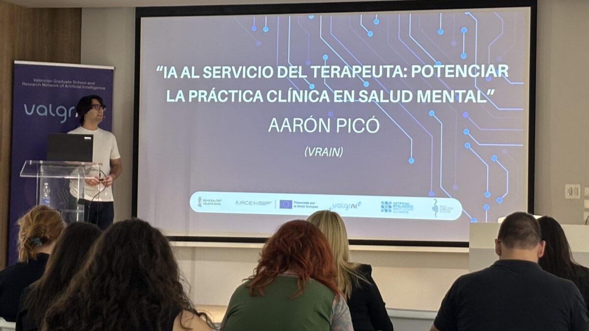 En esta jornada, el investigador del Valencian Research Institute for Artificial Intelligence (VRAIN) de la UPV, Aarón Picó, ha pronunciado la ponencia “IA al servicio del terapeuta: potenciar la práctica clínica en salud mental”. Durante su intervención ha mostrado cómo la inteligencia artificial puede convertirse en una aliada del profesional de la salud mental. Picó ha destacado que, ante el aumento global de los problemas psicológicos y las dificultades de acceso a la atención, están desarrollando herramientas basadas en IA —como apps, chatbots o sistemas de análisis de sesiones— que permiten apoyar la labor terapéutica, mejorar el seguimiento de los pacientes y reducir la carga administrativa de los profesionales.